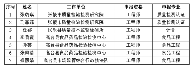 张掖市质量监督食品药品工程专业中级职称资格评审委员会
