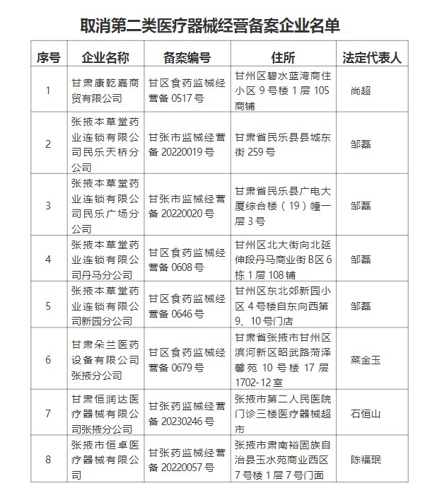 根据企业主动申请,依据《医疗器械监督管理条例》《医疗器械经营监督管理办法》等国家有关法规规章,我局决定对甘肃康乾嘉商贸有限公司等8家企业持有的《第二类医疗器械经营备案凭证》予以取消。