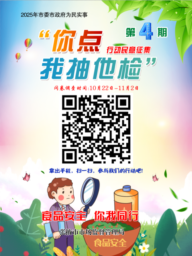 民意征集时间为2025年10月22日至11月2日,诚邀您通过以下方式参与:识别图中二维码或点击文末阅读原文,进入到调查问卷页面,勾选您最关心的抽检场所和食品种类。我们将根据公众点选情况,对社会关注度高、投票集中的场所和食品种类开展专项监督抽检。