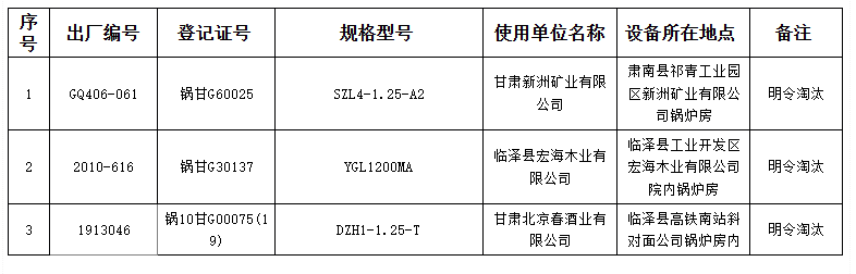 根据《中华人民共和国行政许可法》《中华人民共和国特种设备安全法》《特种设备使用管理规则》《市场监管总局关于加快推动特种设备更新有关工作的通知》《产业结构调整指导目录(2024年本)》等有关规定,经核查,甘肃省新洲矿业有限公司等3家单位的特种设备已属于明令淘汰设备。现依法启动公告注销程序,相关事项公告如下: