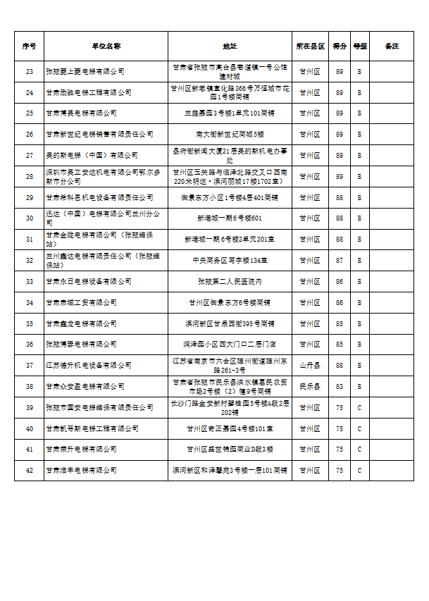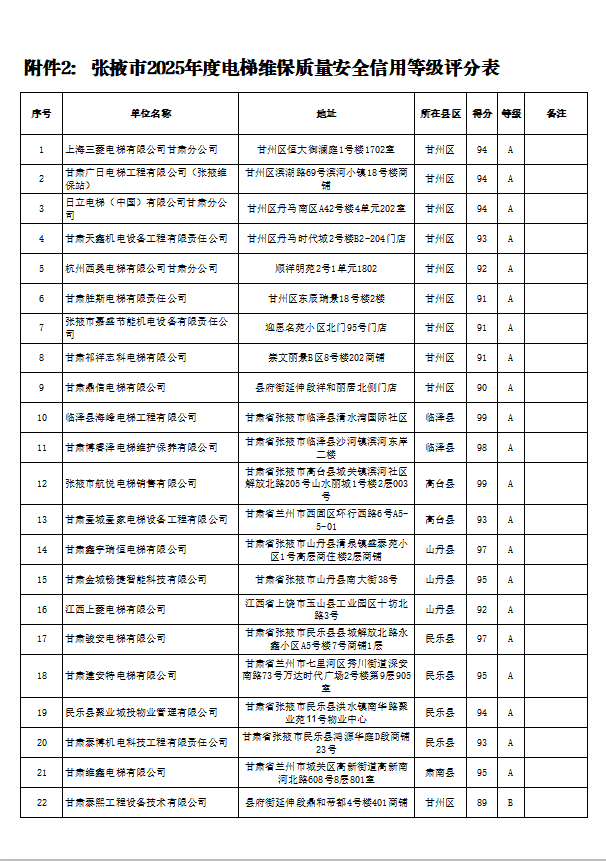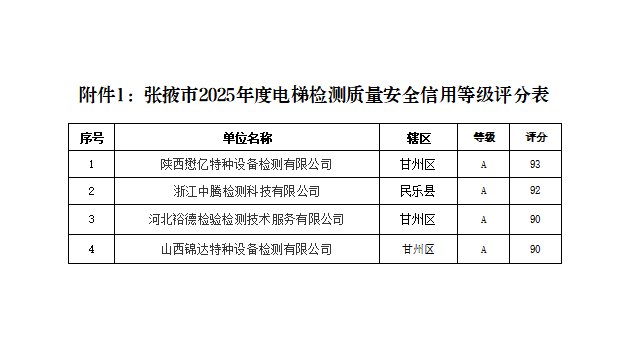 为规范全市电梯检测、维护保养行业秩序,提升电梯安全精准化监管水平,依据《中华人民共和国特种设备安全法》《特种设备安全监察条例》《市场监督管理行政处罚信息公示规定》及《甘肃省电梯检测质量安全信用等级评价管理办法(试行)》《甘肃省电梯维护保养质量安全信用等级评价管理办法(试行)》等相关规定,我局完成了2025年度辖区内电梯检测、维护保养单位质量安全信用等级评价工作。现将评价结果予以公示,接受社会监督。