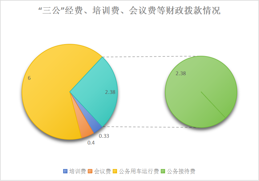 7、“三公”经费:指因公出国(境)费、公务用车购置及运行维护费和公务接待费。其中,因公出国(境)费反映单位公务出国(境)的国际旅费、国外城市间交通费、住宿费、伙食费、培训费、公杂费等支出;公务用车运行维护费反映单位按规定保留的公务用车租用费、燃料费、维修费、过路过桥费、保险费、安全奖励费用等支出;公务接待费反映单位按规定开支的各类公务接待(含外宾接待)支出。