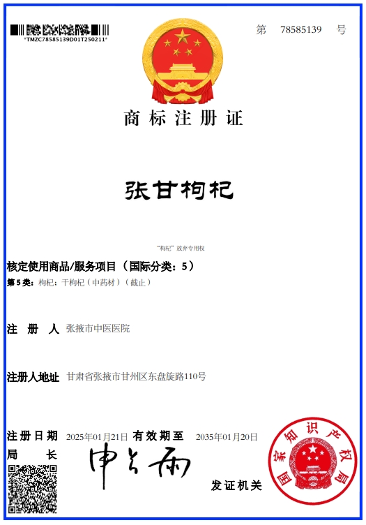 近日,张掖市中医医院申报的“张甘枸杞”商标,被国家知识产权局正式核准注册,标志着医院“甘枸杞”等中医药产业发展取得新进展。