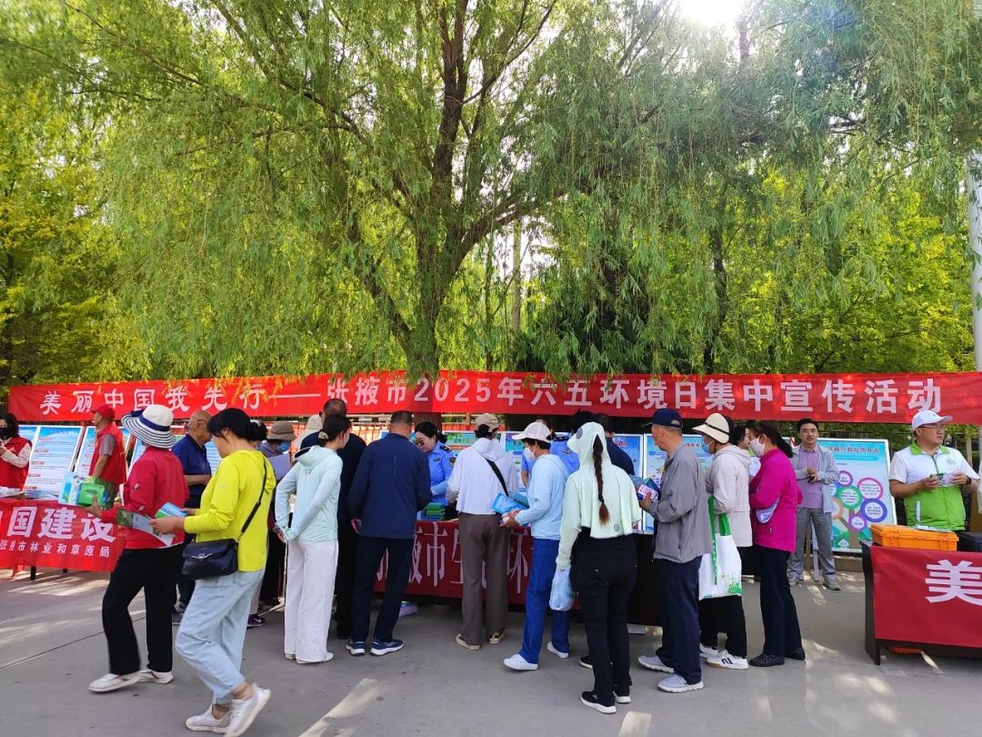 6月5日,市生态环境、林草、湿地、水务、自然资源、农业农村等部门单位,在张掖市甘州区润泉湖公园门口开展以“美丽中国我先行”为主题的2025年“六五环境日”集中宣传活动,号召社会各界携手共进,为建设天蓝水清、土净草绿的美丽张掖贡献力量。