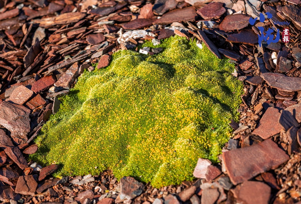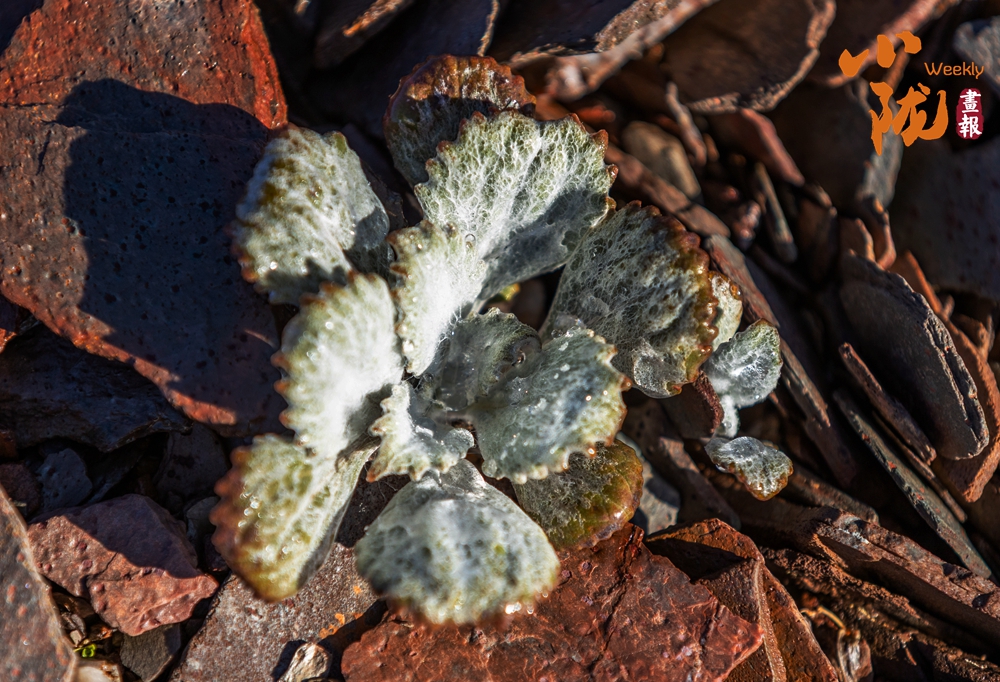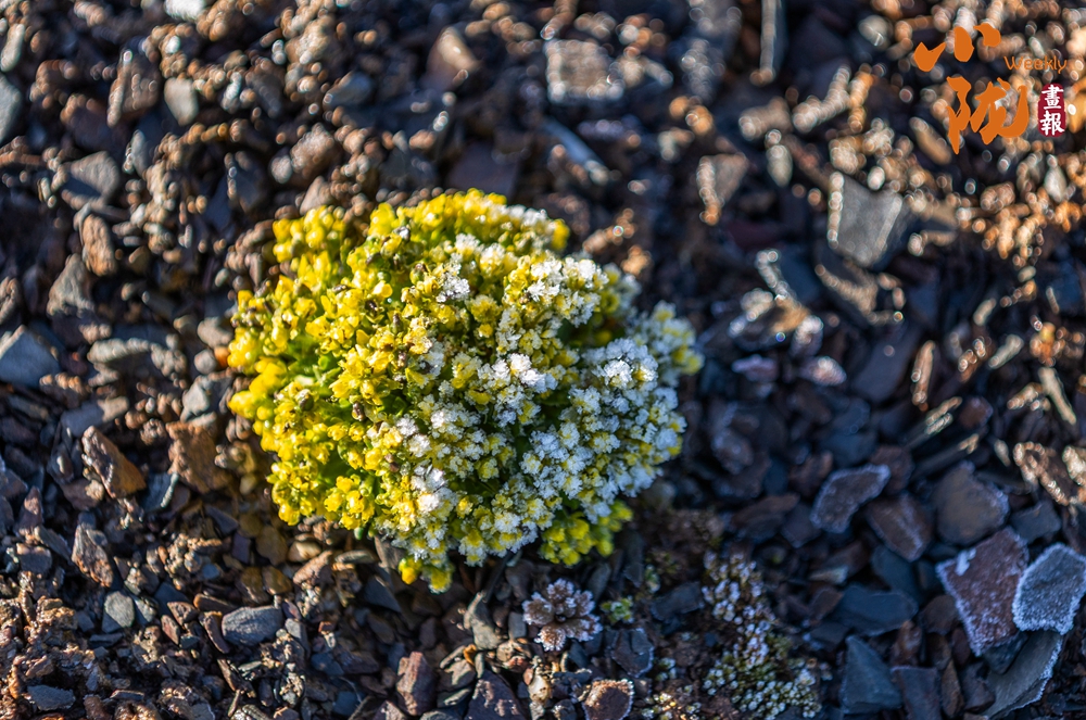 抱茎葶苈,属于十字花科葶苈属的垫状高山植物。它呈紧凑的团块状,叶片密集,表面覆有白色绒毛,顶端开有细碎的黄色小花,生长在碎石环境中,这种形态能帮助它适应高海拔的低温、强风与强紫外线环境,减少水分流失。