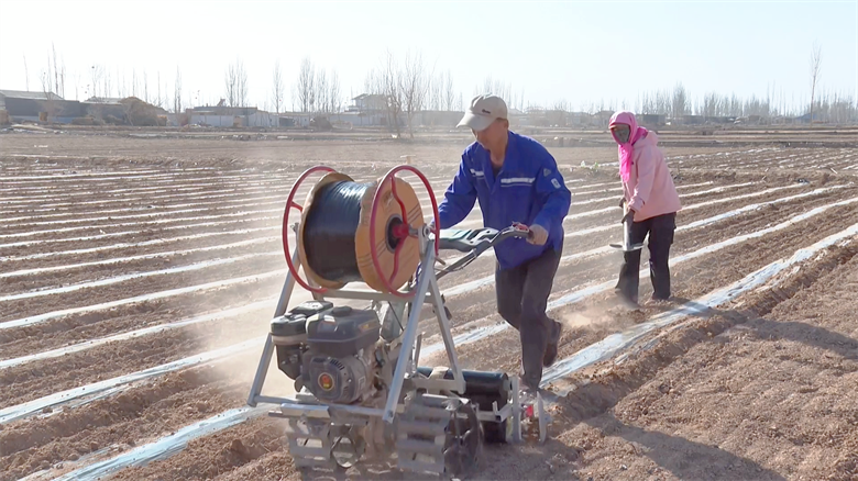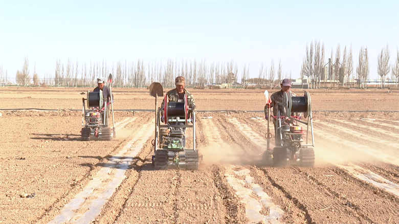 在骆驼城镇永胜村广袤的田野上,处处人头攒动,农户抢农时、抓“墒”机,田间地头呈现一派热火朝天的繁忙景象。随着一台台铺膜机的前进,一条条黑色滴灌带好似“毛细血管”均匀铺开,“水肥一体化”装备通过主管道与田间的滴灌带相连,为后期种植玉米提供便利条件,实现节本增效。“我种了50亩地,现在铺膜一方面保墒,二就是等公司通知,通知什么时候种我们就什么时候种,到时候我们也就不紧张了。”村民肖进军介绍道。
