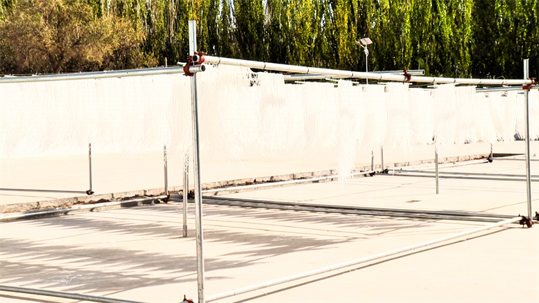 在骆驼城镇建康村味之源食品有限公司的粉条加工车间,机器轰鸣声此起彼伏,工人们将一团团白色马铃薯淀粉放入机器里,经过压粉塑形、沸水捞粉、通风晾晒等标准化工序,原本的淀粉逐渐蜕变成一缕缕白色粉条,错落有致地晾晒在院中,晶莹剔透,格外亮眼。“我们村今年新建了一个粉条厂,9月15号我们开始启动运行生产粉条,到目前生产了10天左右,1天的生产量基本上是400斤左右。”骆驼城镇建康村村委会副主任蔡永军说。