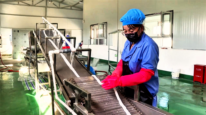 今年该村精准锚定产业增收目标,积极争取项目资金80万元,建成占地2700多平方米的粉条厂,同步引进一条现代化加工生产线,通过“党总支+公司+农户”的模式,打造具有特色的“建康粉条”产业。依托本地优质原料和传统工艺,严控粉条品质,让兼具口感与安全的本土粉条走向市场,真正实现了“资源变资产、资产变收益”的良性循环。“我们的粉条主要是通过零售和批发外销,1斤粉条是12元,我们也是全年生产,一年可以给村集体经济增收10万元。”骆驼城镇建康村村委会副主任蔡永军介绍道。