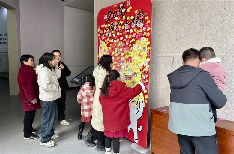 现场气氛最热烈的环节当属“信念凝聚”集体书法。几位小朋友共同握持一支近一米长的特制毛笔,在宣纸上协作写下“平安”“大吉”。这不仅考验着他们的耐心,更让团结一心的精神在笔墨间传递。孩子们还在许愿墙前,用彩色便利贴写下稚嫩而真挚的新年愿望和对革命先烈的深切缅怀,为这个充满红色记忆的春节画上了温暖的句点。