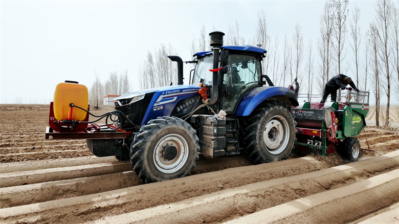在奇峰马铃薯专业合作社位于新坝镇许三湾的种植基地里,两台大型农机来回穿梭,施肥、播种、打药一气呵成。今年,合作社计划种植马铃薯5500亩,截至目前已高标准完成2000亩播种任务。