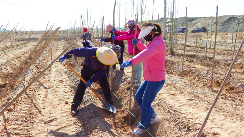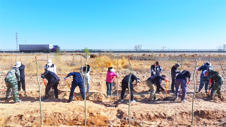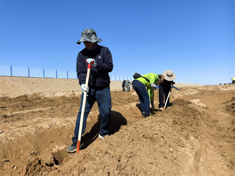 在位于罗城镇的万丰滩义务植树基地,同样是一派热火朝天的劳动景象。各单位干部职工意气风发、干劲十足,分工协作,拉线打点、挥锹挖穴、扶直树苗、培实新土,整套动作一气呵成。随着一株株新苗迎风挺立,昔日的荒滩即将披上绿装,为高台绿洲构筑起一道坚实的生态安全屏障。