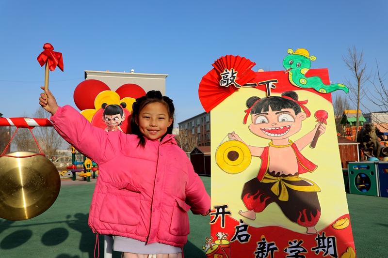 为迎接孩子们入园,幼儿园积极挖掘传统文化元素,精心设置了打卡拍照区,童趣十足的卡通立牌,还有新学期祝福的背景板,每一处都充满了创意与惊喜。其中“哪吒”卡通立牌成为入园的焦点,孩子们兴奋地在打卡板前驻足,合影留念,记录下新学期的珍贵瞬间。