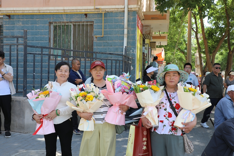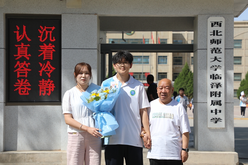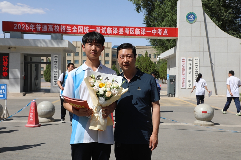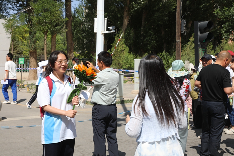 在临泽县第一中学考点,不少家长早早来到考场外静静等候。他们手持鲜花,拿着手机拍摄记录,准备迎接考生,和孩子们共同分享喜悦时刻。