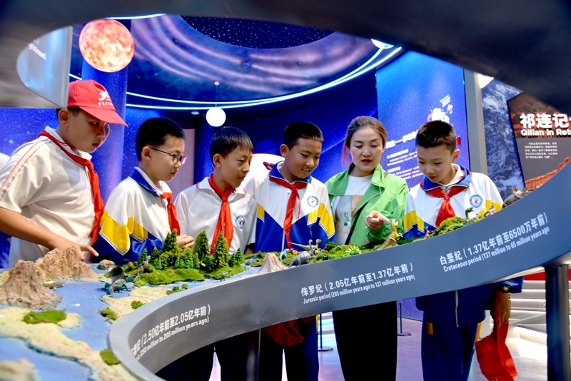 在祁连山国家公园自然博物馆,同学们通过3D地质演变动画及电子互动屏,直观了解了祁连山亿万年的造山运动、冰川发育过程,亲手模拟板块碰撞、河流改道等地质现象。同时,借助电子互动屏,探索区域内珍稀动植物分布,查询生态系统的动态平衡机制,深度理解山脉、河流、生物间的依存关系,将抽象的地质、生态知识转化为生动的实践认知。科学老师何正新说:“亲眼所见和亲身体验,比书本更能让人记住知识,从地质演变到生物多样性,这里的每一样展品都在告诉我们,自然的奥秘需要我们用科学的眼光去探索,更要用行动去守护。”