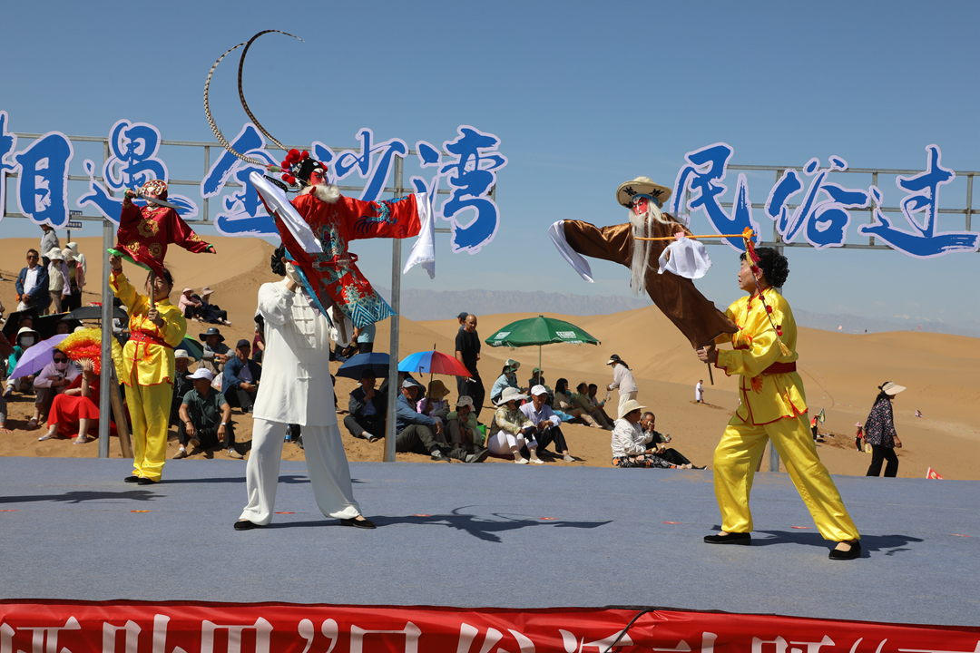 上午9时,金沙湾沙漠旅游景区内锣鼓喧天,舞龙舞狮等非遗展演为活动热场。张掖秦腔、甘州杖头木偶戏、裕固族民歌等非遗项目轮番登场,吸引数百名游客驻足观看。