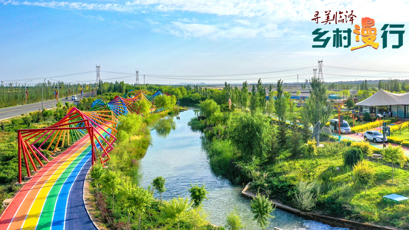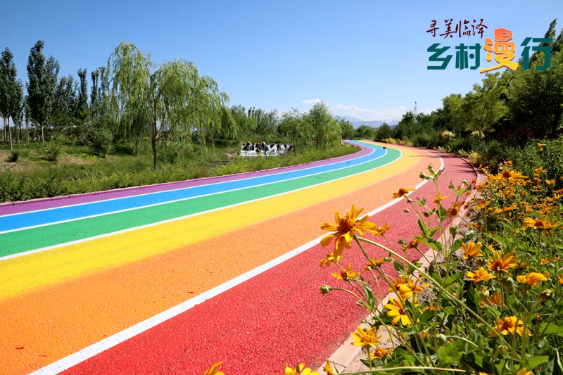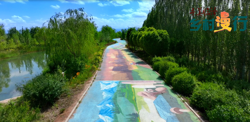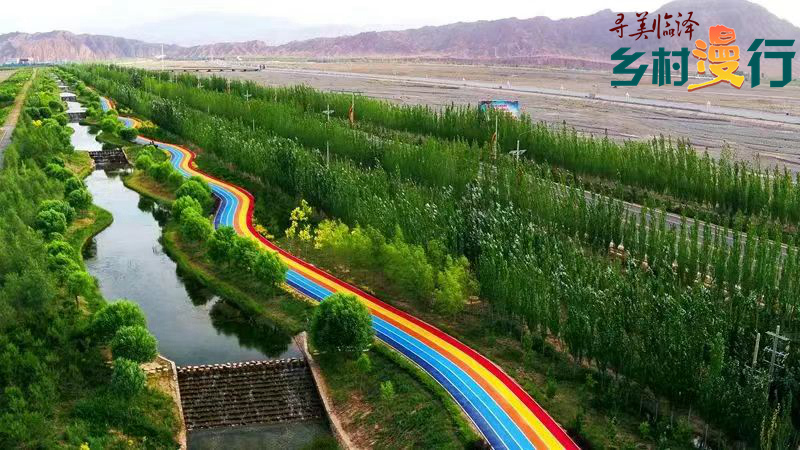 步道之上,惊喜连连。12幅长达33米的巨型大地彩绘,仿佛打开的立体画卷,生动讲述着临泽的故事:饱满金黄的玉米田铺展着丰收的喜悦,青翠欲滴的蔬菜园流淌着生机,欢腾的牧场孕育着丰饶,甜美的果园溢出芬芳,蓬勃的食用菌基地与翱翔蓝天的通航梦想,共同编织着这片土地的活力图景。更有“沙河望春”的清新明媚、“双泉映月”的静美空灵、“昭武故地”的历史余韵、“黑河烟林”的朦胧诗意、“峡谷奇观”的险峻壮阔、“羊台夕照”的辉煌温婉……它们与上方60榀造型独特的彩虹钢结构廊道交相辉映,构成了独一无二的风景线。