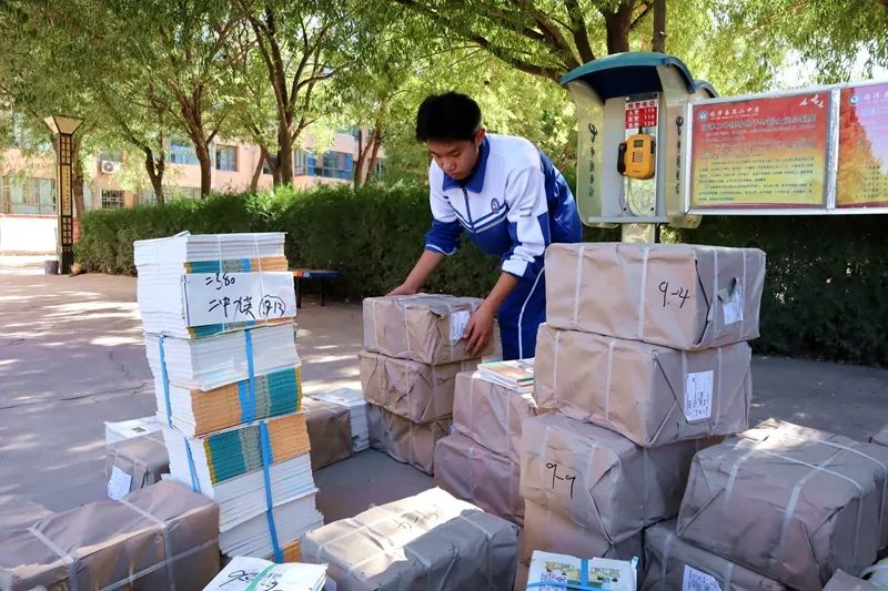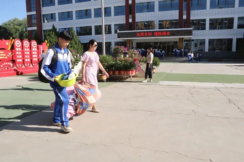 在临泽县第二中学,学校负责人、值日老师一起在校门口迎接开学归来的学生。学生们搬运行李、收拾床铺、领取新书,各项工作顺利进行。