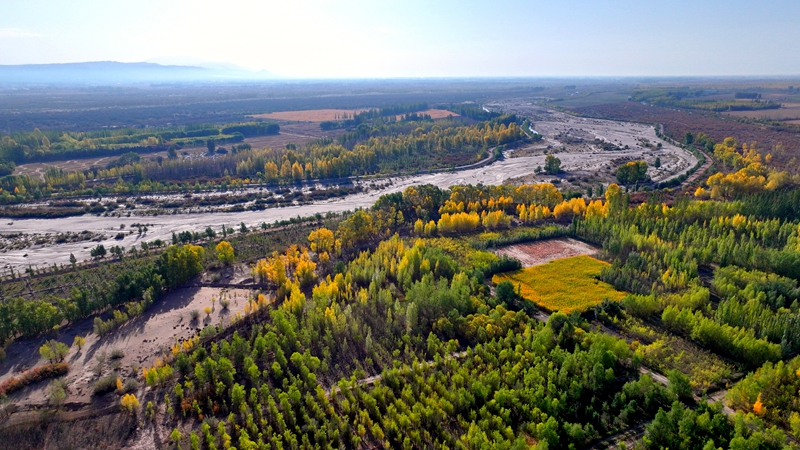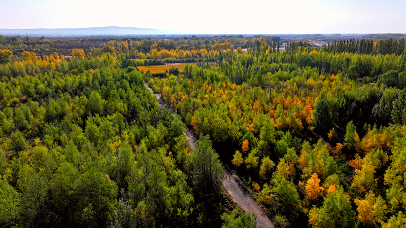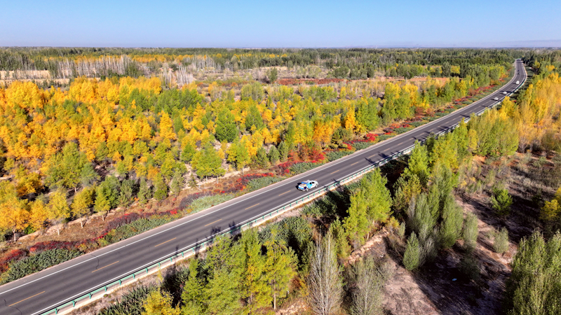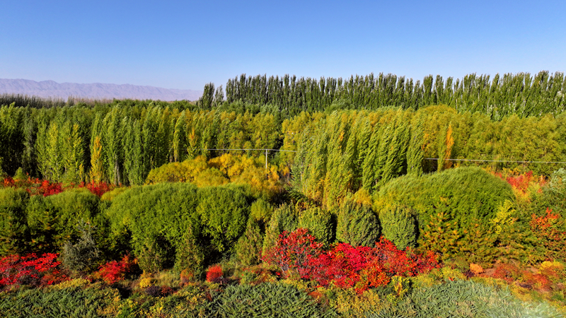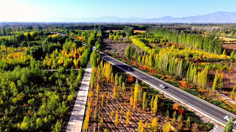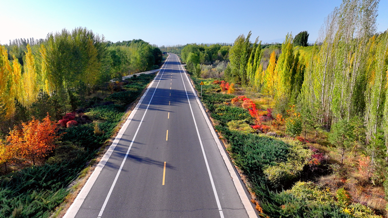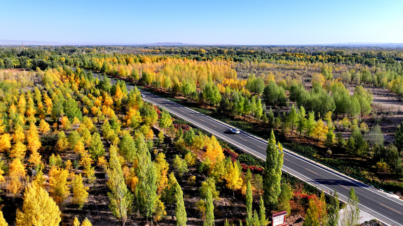 深秋时节,沿沙柳路驱车而行,道路便成了这画卷中蜿蜒的引导线。路的两旁,是挺立了数个季节的树木。此刻,它们卸下了所有的含蓄,将生命积攒的力量,尽数化作了奔放的色彩。胡杨是纯粹的金黄,一树树,一丛丛,像无数柄燃烧的金色火焰,在湛蓝的天幕下灼灼生辉。微风拂过,那叶片便簌簌而下,不是凋零的哀愁,而是一场轻盈的、金色的雨。枫树则染上了深浅不一的红,从羞涩的绯红到醉人的酡红,层层叠叠,仿佛天边的云霞不小心跌落枝头。尚有未肯尽褪绿意的青松,与这金黄、绯红交织在一起,构成一幅色彩斑斓的锦缎,浓烈得几乎要溢出视野。