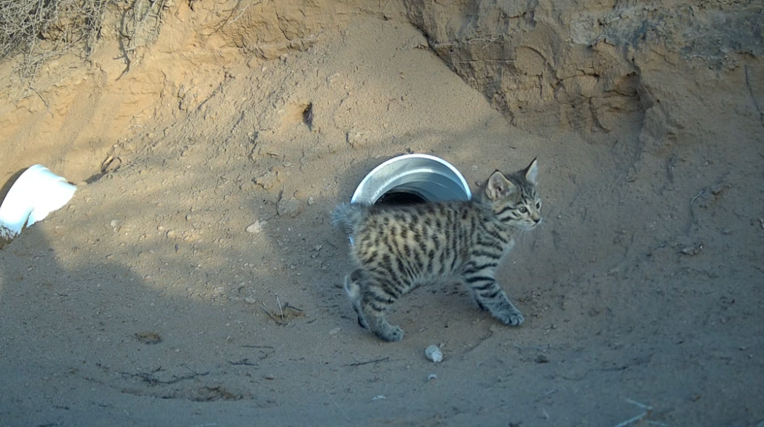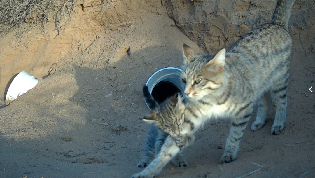 近日,在临泽县北部沙区,调查人员通过红外相机监测,首次记录到亚洲野猫和赤狐在人工洞穴内繁育幼崽的影像。画面中赤狐和亚洲野猫在人工洞穴内相互打闹、嬉戏玩耍,萌态十足。此次拍摄到的画面充分反映了临泽县北部沙区内物种食物链完整,野生动物食物充足,为中小型食肉动物提供了稳定、安全的繁殖环境。