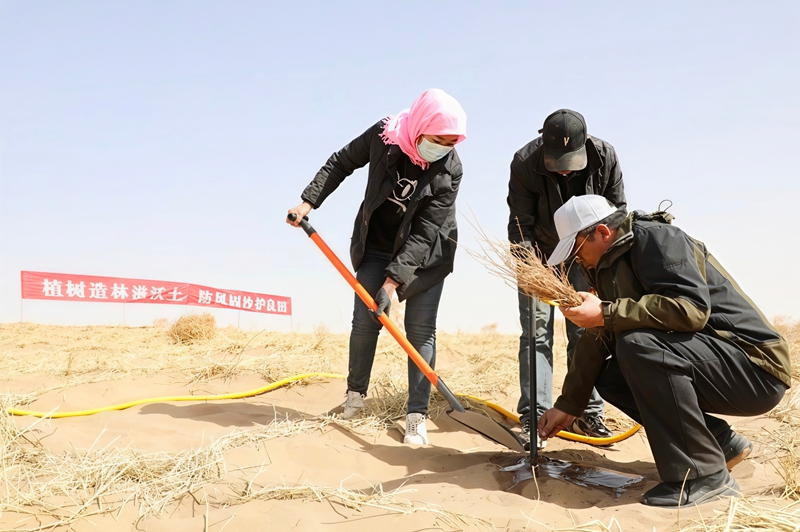 正午的沙漠地表温度渐升,职工们趁着一小时的休整时间,在沙地上席地而坐,就着自带的咸菜啃干粮。“以前连水都喝不上,得去几里外的地方担,现在苗木能喝上‘及时水’,我们也不用再为喝水发愁。”职工们望着一排排苗木欣慰地说道。午后的工作更显繁重,他们背着水桶穿梭在苗木间,小心翼翼地给刚栽种的梭梭、柽柳浇水,每一株苗木都要浇透,确保根系能扎进沙层。夕阳西下时,余晖洒在沙地上,拉长了他们的身影,直到天色擦黑,他们才拖着疲惫的脚步返回驻地。