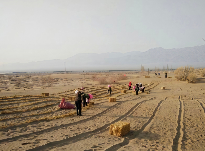天刚蒙蒙亮,小泉子林场的驻地便已热闹起来。简单的干粮配着热水,是务林人雷打不动的早餐,随后他们便扛起工具,踏着晨霜奔赴治沙一线。“一亩地要铺300个麦草方格,一人一天得栽几百棵梭梭苗,慢一点就赶不上风沙的节奏。”老职工王师傅一边弯腰铺展麦草,一边说着。黄褐色的沙地上,十几名职工一字排开,将麦草切成规整的小段,平铺在沙丘上,再用铁锹将两端压入沙层,形成一个个交错的方格,如同给流沙穿上“束缚衣”。在风里,风沙迷得人睁不开眼,他们便用毛巾裹住口鼻,只露出坚毅的双眼,手上的血泡破了又结,袖口裤脚沾满沙尘,却没人停下手中的活计。