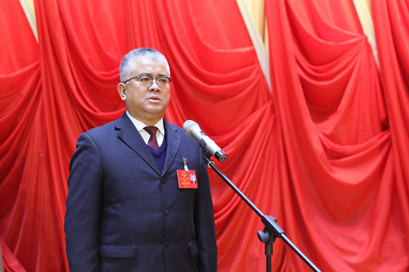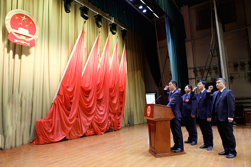 县委书记张鹏主持宣誓仪式,出席民乐县第十九届人民代表大会第五次会议的全体人大代表共同监誓。