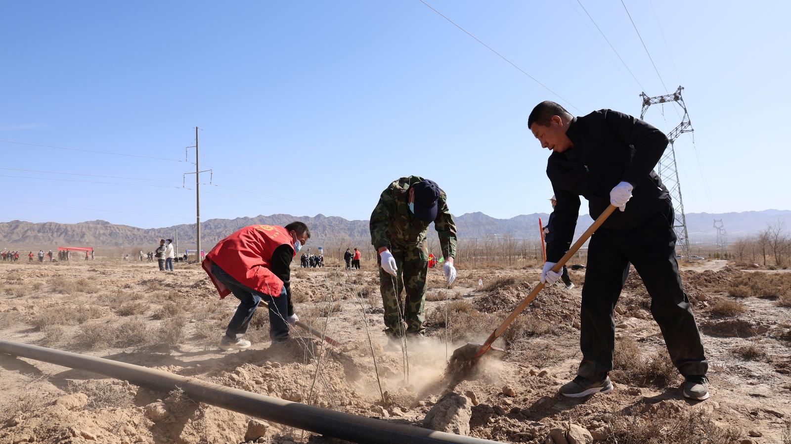 植树现场热火朝天,众人分工协作,干劲十足,扛苗撒苗、挥锹挖坑、培土压实、提桶浇灌……各环节紧密衔接,配合默契。经过大家的辛勤劳作,一株株柠条、榆树等新栽植的树苗迎风挺立,为山丹的生态屏障再添新绿。