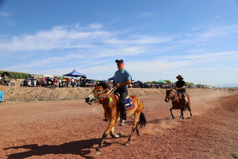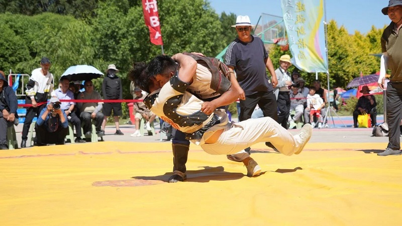 与此同时,传统体育竞技则将活动推向高潮。搏克比赛、射箭、打瑟日、赛马、徒步等项目吸引了众多农牧民选手参与。在搏克比赛中,身着皮甲的选手们两两对决,在助威声中施展巧劲与谋略,摔打间尽显蒙古族男儿的勇猛与豪迈。在赛马场上,骑手们策马扬鞭、风驰电掣,展现出娴熟的骑术和昂扬的斗志;射箭场内,选手们凝神聚气、拉弓射箭,精准的瞄准和稳健的动作尽显传统体育的独特魅力。赛场上选手们奋勇拼搏,赛场下观众们欢呼呐喊,整个活动现场洋溢着热烈而欢快的氛围。