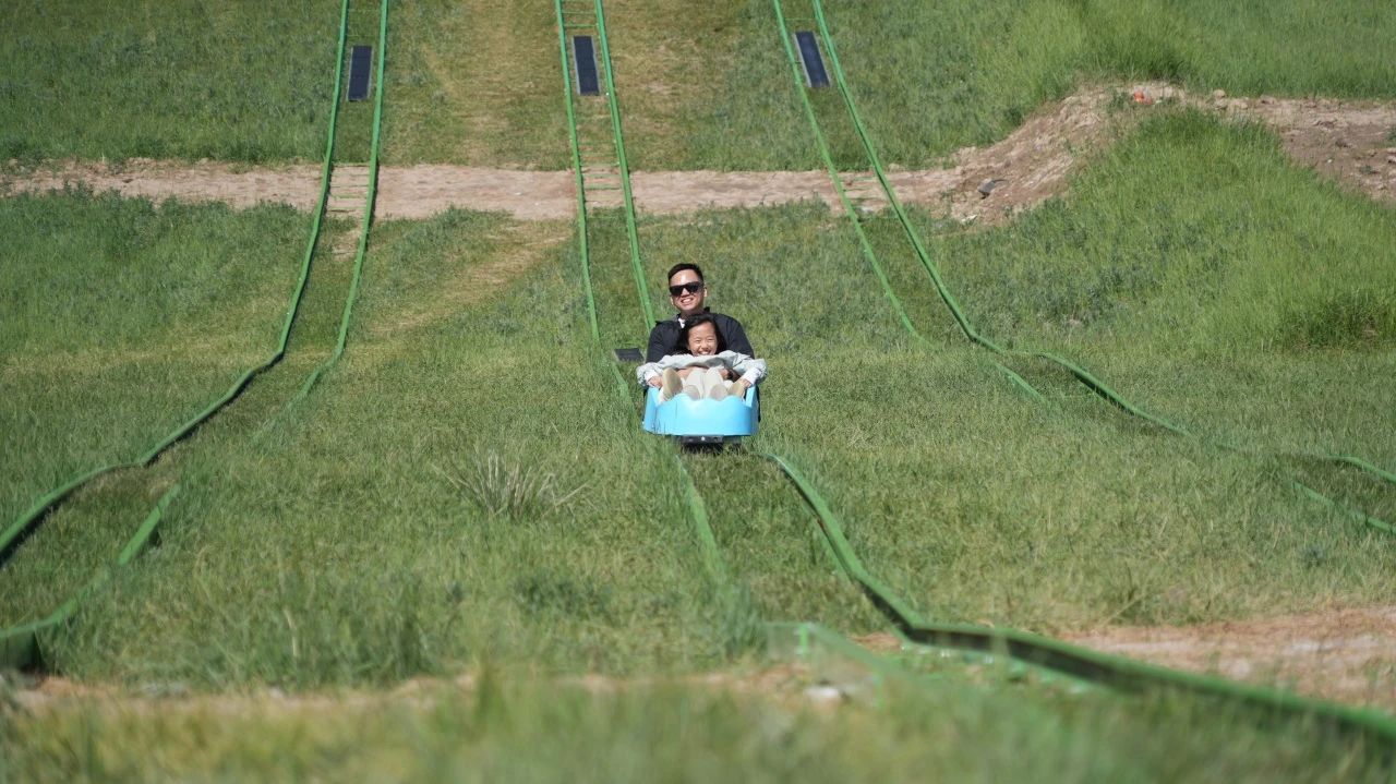从银装素裹到碧草如茵,季节的更迭在这里催生出别样活力。近日,记者来到祁连山滑雪场改造现场,昔日的滑雪赛道已被细密的青草覆盖,施工人员正沿着山势有序铺设滑道,景观小品点缀其间,部分区域已完成基础施工。提前探访的游客已在临时开放区试滑,他们乘着滑草板顺坡疾驰而下,尽情感受草上飞驰的乐趣,欢声笑语不时回荡在草原山间。