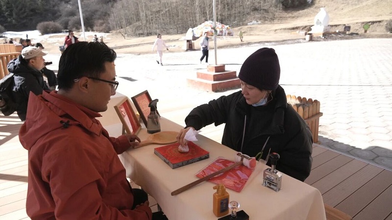 红崖石窟与青山相映,步道上游人如织、笑语不断。马蹄石窟群旅游区已经成为游客心中的“打卡胜地”。祁连雪山为背景,三十三天石窟红砂岩与白雪相映成趣,随手一拍皆是氛围感大片,最受欢迎的当属骑马游览项目,游客们跃上马背,穿行于山道与石窟之间,马蹄声声清脆,伴着欢声笑语回荡山谷。景区推出的马年限定拓印体验,更是让游客们驻足流连,墨香氤氲间,大家在专业指导下亲手复刻千年蹄印,一张张带着温度的拓片,既是独属于马年的新春纪念,也让非遗技艺与新春祈福完美交融,亲子携手、挚友相伴的温馨画面在体验区随处可见。