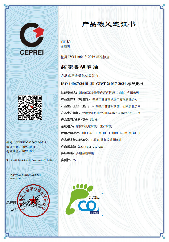 2025年10月31日,张掖市甘脉粮油加工有限责任公司迎来重要发展里程碑——该公司主要产品“拓家香胡麻油”正式获得产品碳标签认证,成为甘肃省粮油食品行业绿色低碳发展的先行者。