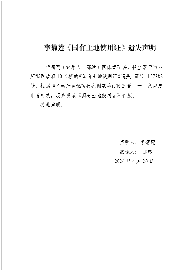 李菊莲《国有土地使用证》遗失声明