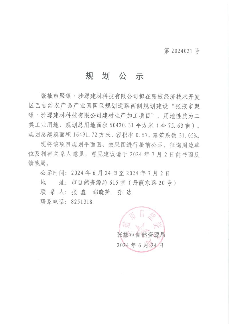 张掖市聚银·沙源建材有限公司建材生产加工项目规划公示