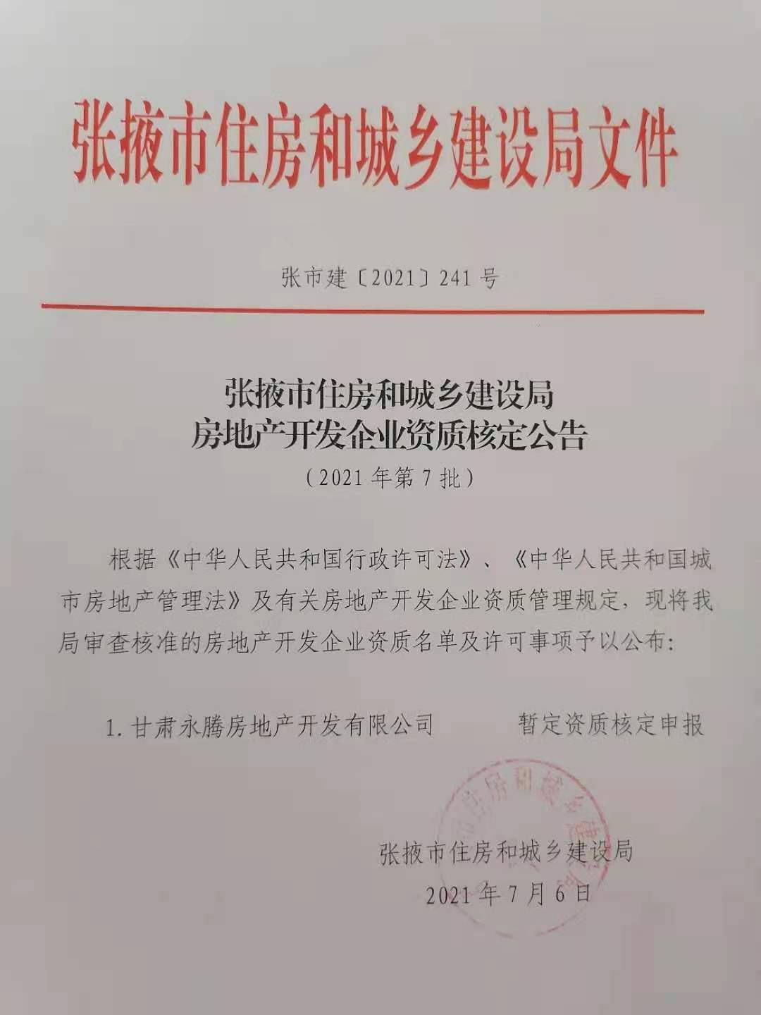 甘肃永腾房地产开发有限公司 暂定资质申报