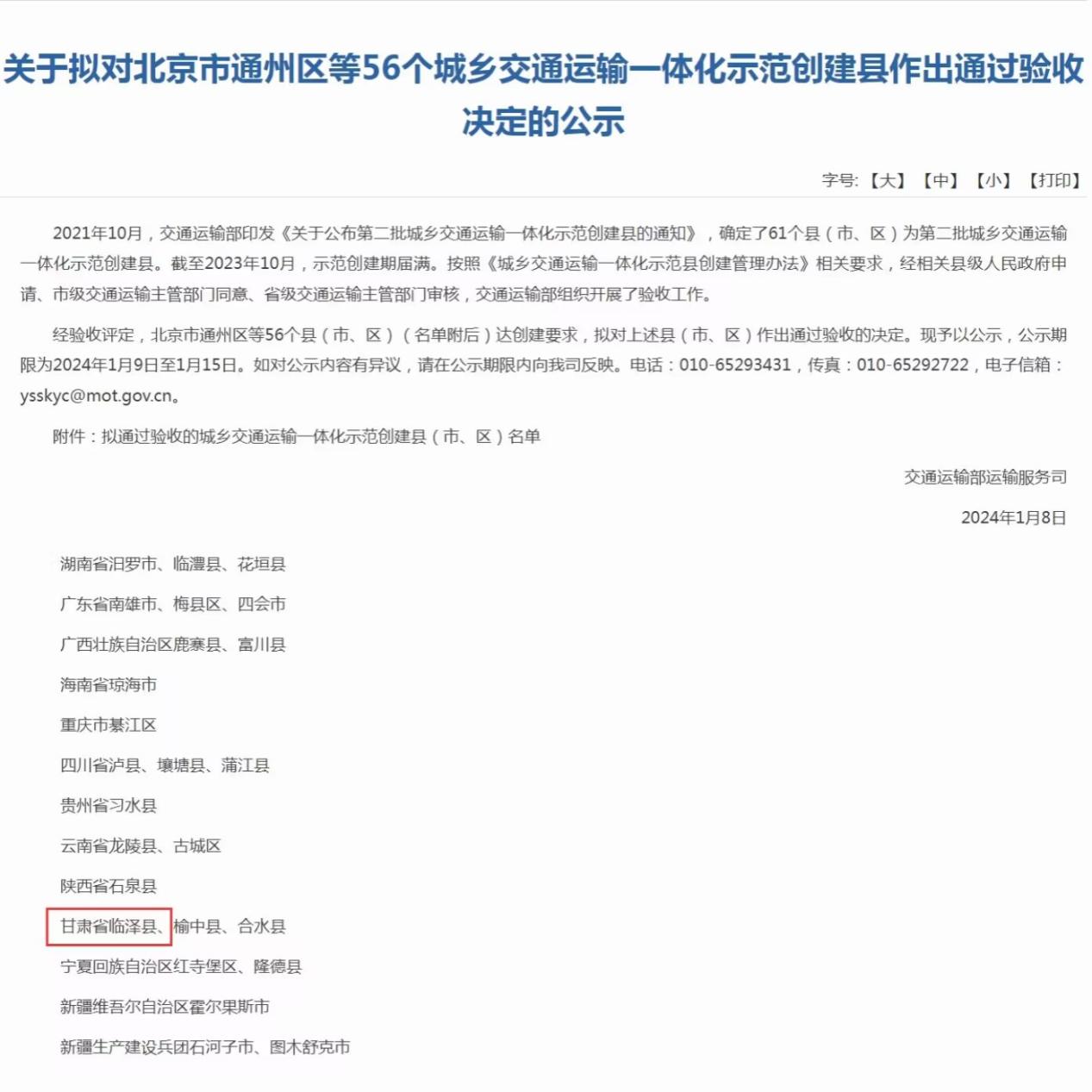 2024年1月8日,交通运输部公布通过验收决定的全国第二批城乡交通运输一体化示范创建县名单,临泽县榜上有名。