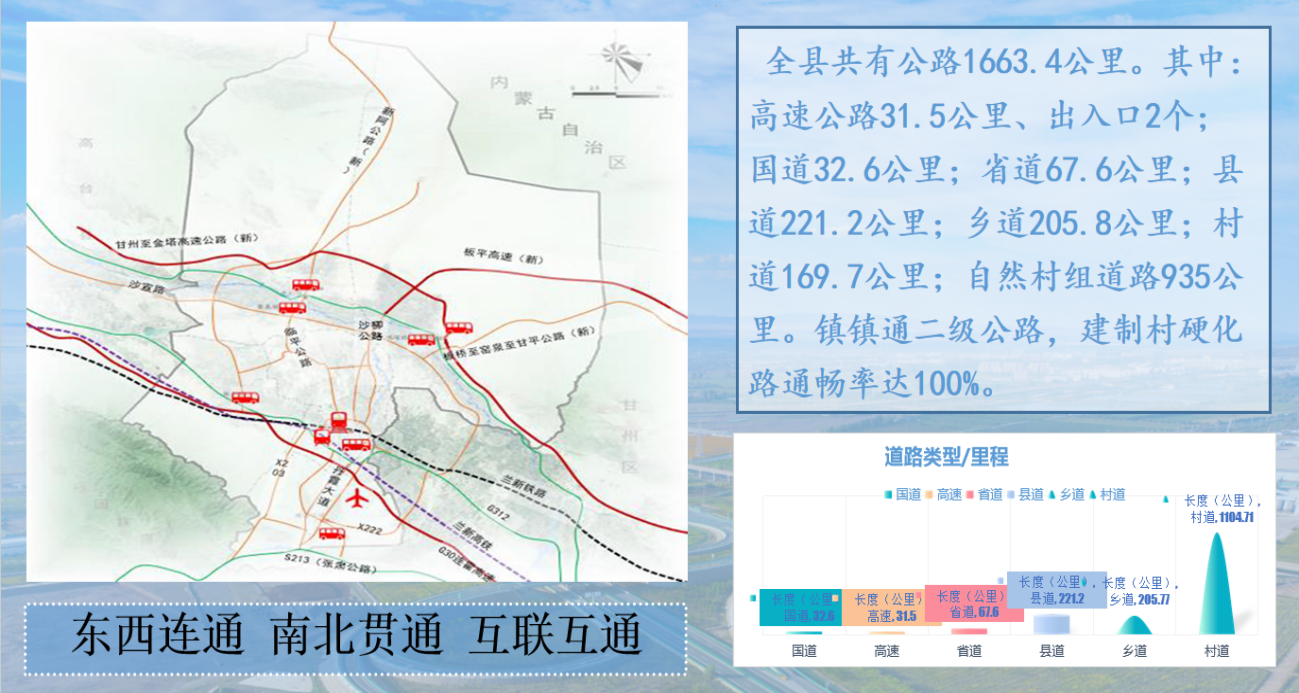 聚焦打造丹柳路“鸟语花香”生态旅游廊道、临平路“泉水叮咚”生态经济廊道、张罗路“琳琅满目”特色产业廊道、312国道“车水马龙”通道经济廊道4条乡村振兴示范廊道,公路建设与水系连通、绿化美化、产业布局、旅游发展同频共振,大力推进“交通+”工程,建成了丹霞大道、临平路等一批“生态路”“风景线”“产业路”。着眼“最美农村路”建设,以“畅、安、舒、美”“四好农村路”绘就和美乡村画卷,持续刷新村民幸福感、获得感,沙柳公路入围全国“平安绿色放心路”。拓宽交通新业态,大力发展路衍经济,开工建设G30丹霞服务区、公路港物流园等项目,努力在大通道上建好“黄金驿站”,让通道优势转变为经济优势,为推动县经济域实现高质量发展注入了新的动力。公路港物流园加油加气站建成投入运营,G30高速服务区综合楼主体已完工,年内建成投入使用。