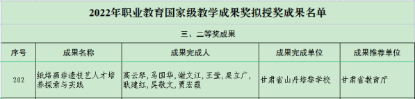 近日,教育部网站发布了2022年职业教育国家级教学成果奖拟授奖成果评审结果,我校正高级教师高云琴主持完成的《纸烙画非遗技艺人才培养探索与实践》获得国家级教学成果奖二等奖。国家级教学成果奖评选始于1989年,每四年一届,代表全国教学成果的最高水平。 2022年共评选出特等奖2项、一等奖70项、二等奖500项。
