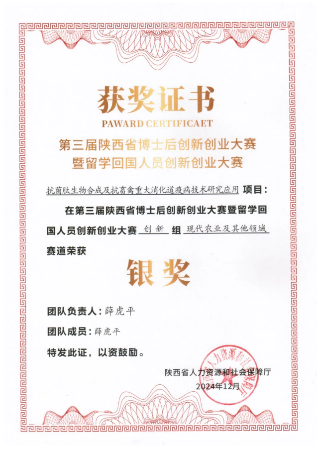 近日,由甘肃奥林贝尔生物科技集团有限公司与西北农林科技大学联合申报的“抗菌肽生物合成与抗畜禽重大消化道疫病技术研究应用”项目,分别在“2024年秦创原·沣东杯陕西省科技工作者创新创业大赛”荣获二等奖;“第三届陕西省博士后创新创业大赛暨留学回国人员创新创业大赛”荣获银奖。近年来,该企业已研发生物抗菌肽系列新技术、新产品8项,拥有有效专利20多项,研发的生物抗菌肽系列科技成果荣获省级以上荣誉5项。
