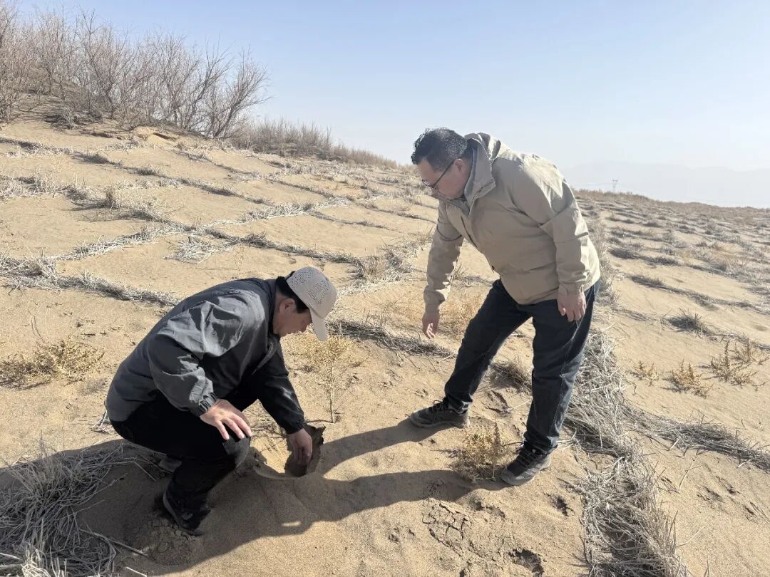 春回大地万物苏,治沙添绿正当时。张掖市林业科学技术推广站近期组织技术人员先后前往临泽县鸭暖镇、蓼泉镇,实地踏查人工造林治沙示范点的梭梭成活情况。
