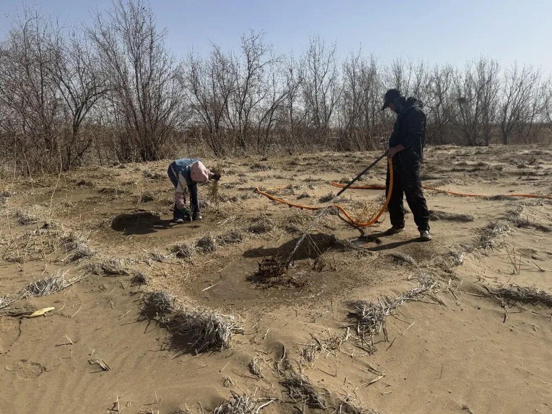 受去冬今春持续低温及大风天气影响,部分新栽梭梭受害明显,枝条干枯、根系外露、苗干风蚀脱皮,预计平均成活率较上年春季下降两成以上。针对这一情况,市推广站迅速制定补植补造方案,并在风蚀严重区域增补草方格沙障。计划采用高压冲穴加覆干沙保墒的措施补栽梭梭苗木2万余株,抢在梭梭春芽萌动前完成全部补植任务。在现场,技术人员还围绕梭梭裸根苗栽植、补水保湿、风蚀防护等关键环节,从挖坑深度、苗木修剪到培土压实,逐一指导施工人员与当地林农,力求提高补植成活率,巩固治沙成果,尽早恢复林分生机。