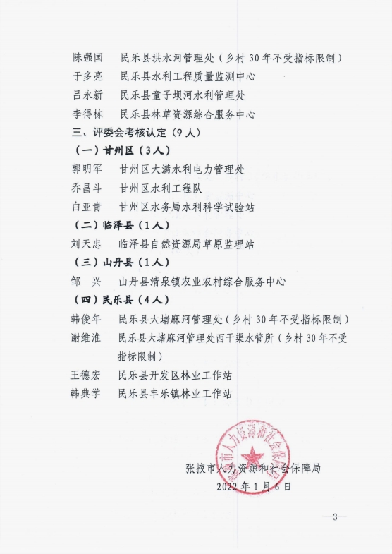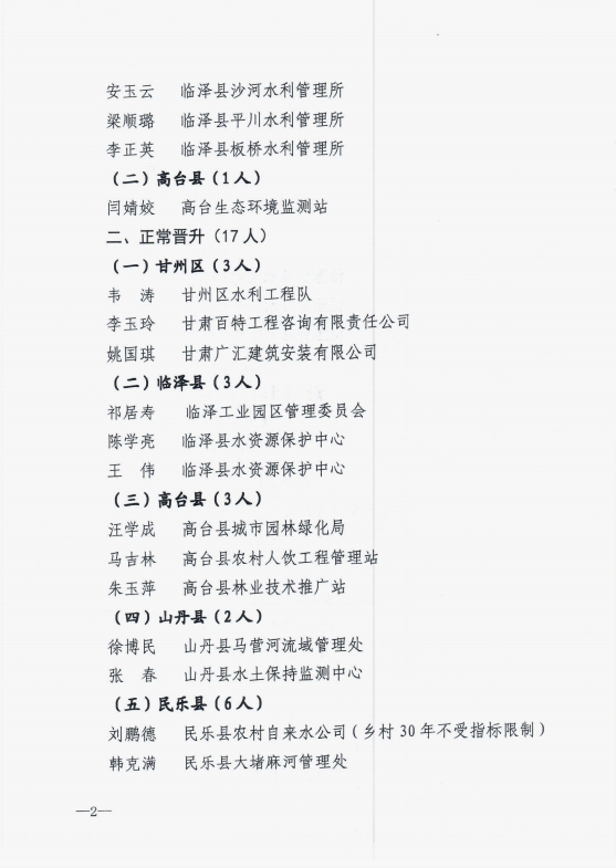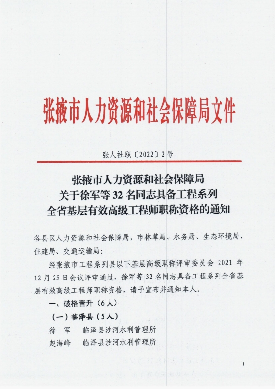 张掖市人力资源和社会保障局关于徐军等32名同志具备工程系列全省基层有效高级工程师职称资格的通知