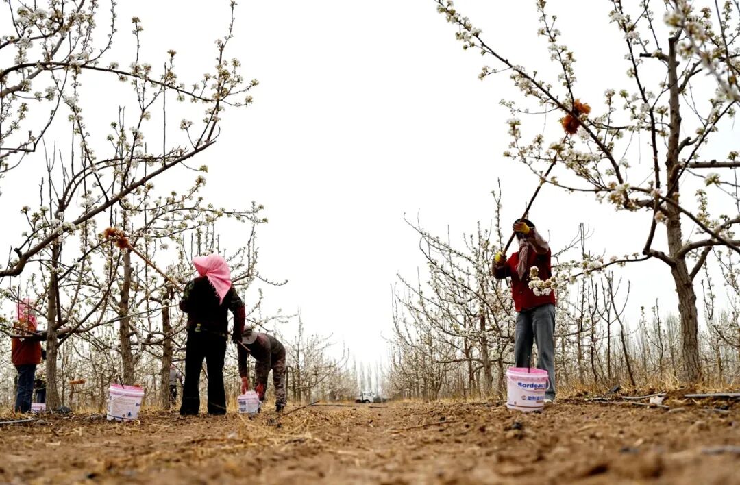 春暖梨花开,授粉正当时。眼下,甘州区石岗墩万禾草畜有限公司千亩梨园迎来盛花期,果农们抢抓晴好天气,积极开展人工授粉作业。张掖市林业科学技术推广站及时组织技术人员深入田间,开展早酥梨花授粉技术指导与志愿服务活动。