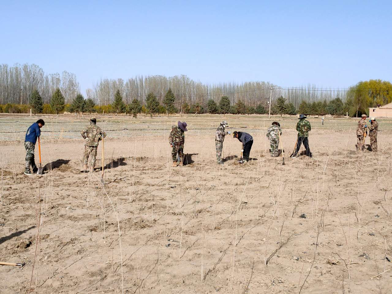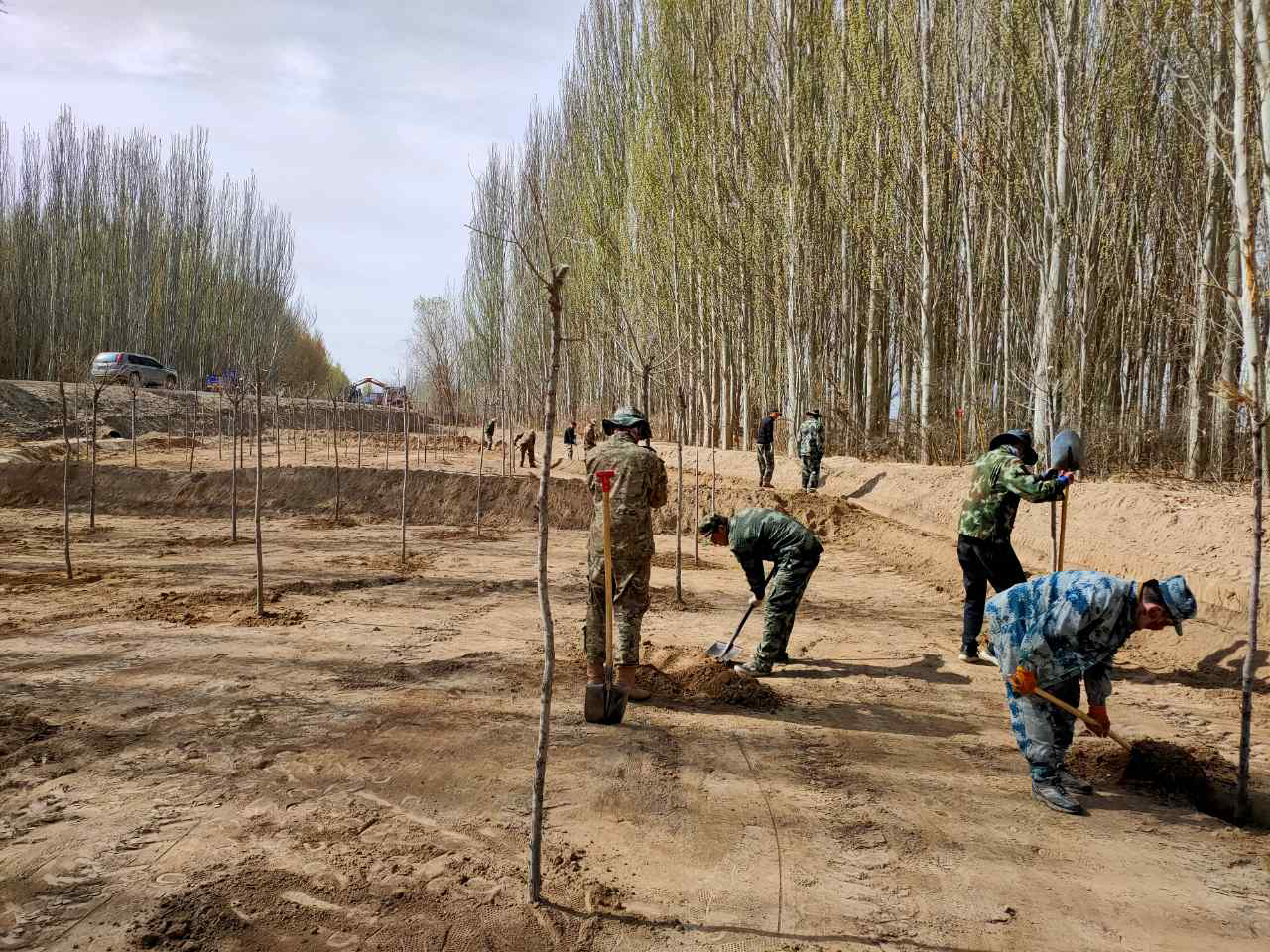 育苗现场,技术人员严把苗木质量关,精细分类,认真修剪。三五人一组,分工明确,相互配合,严格按照育苗技术规程进行土壤消毒、苗木修剪、定植、灌水,圆满完成了春季育苗工作,共定植培育胡杨苗木2000余株。