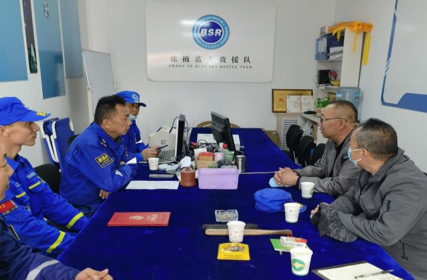 在张掖蓝天救援队,该队张良队长向专责组汇报了近期工作情况,提出了在日常工作中遇到的困难。专责组组长方得海同志给予了现场解答,对该队的发展壮大提出了意见建议。