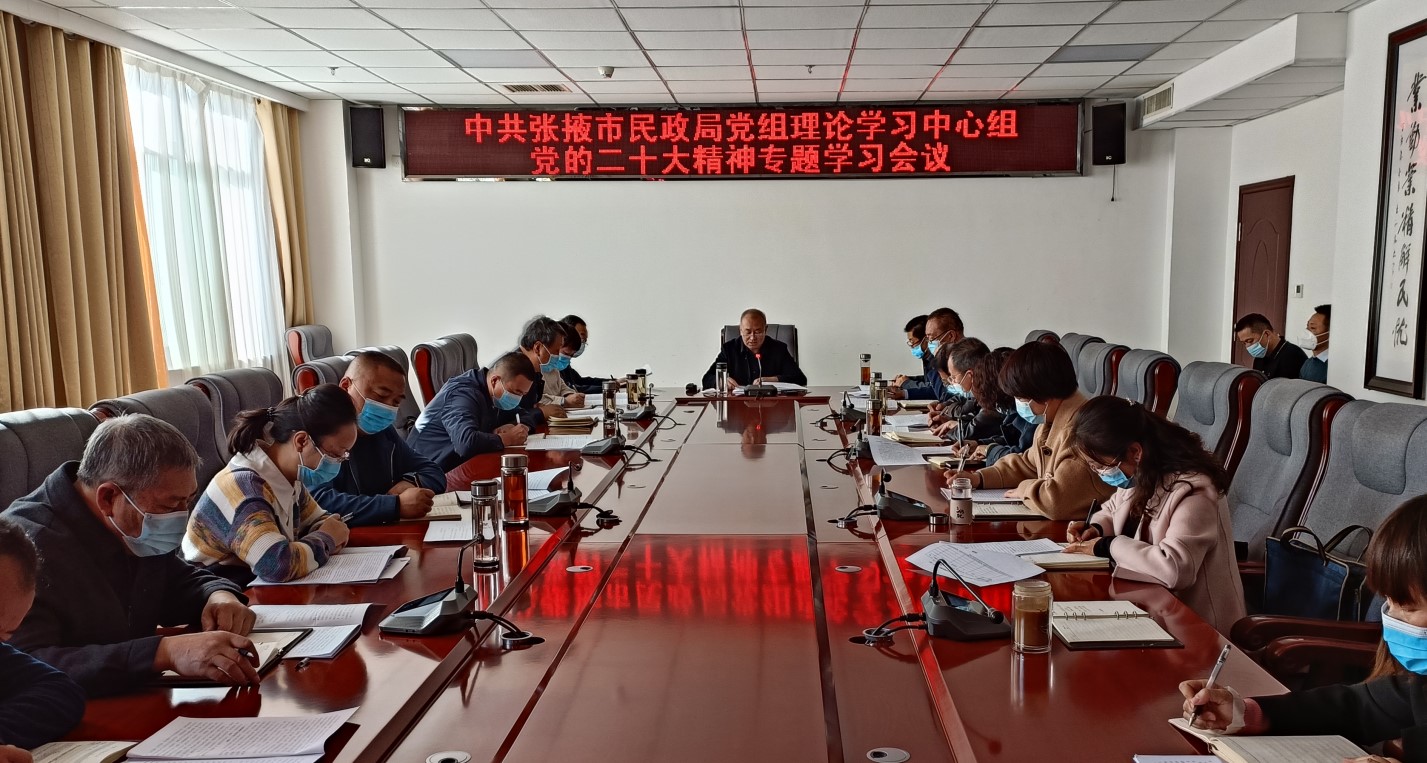 11月1日下午,市民政局召开党组理论学习中心组第10次学习会议,专题传达学习党的二十大精神。会议集中学习了《习近平同志在中国共产党第二十次全国代表大会上的报告》《中共中央关于认真学习宣传贯彻党的二十大精神的决定》,以及习近平总书记在中共中央政治局第一次集体学习和在瞻仰延安革命纪念地时的重要讲话精神。局党组书记、局长牛生乐主持会议并传达学习了10月25日全市党政主要领导干部会议精神,安排部署了局系统学习宣传贯彻工作。