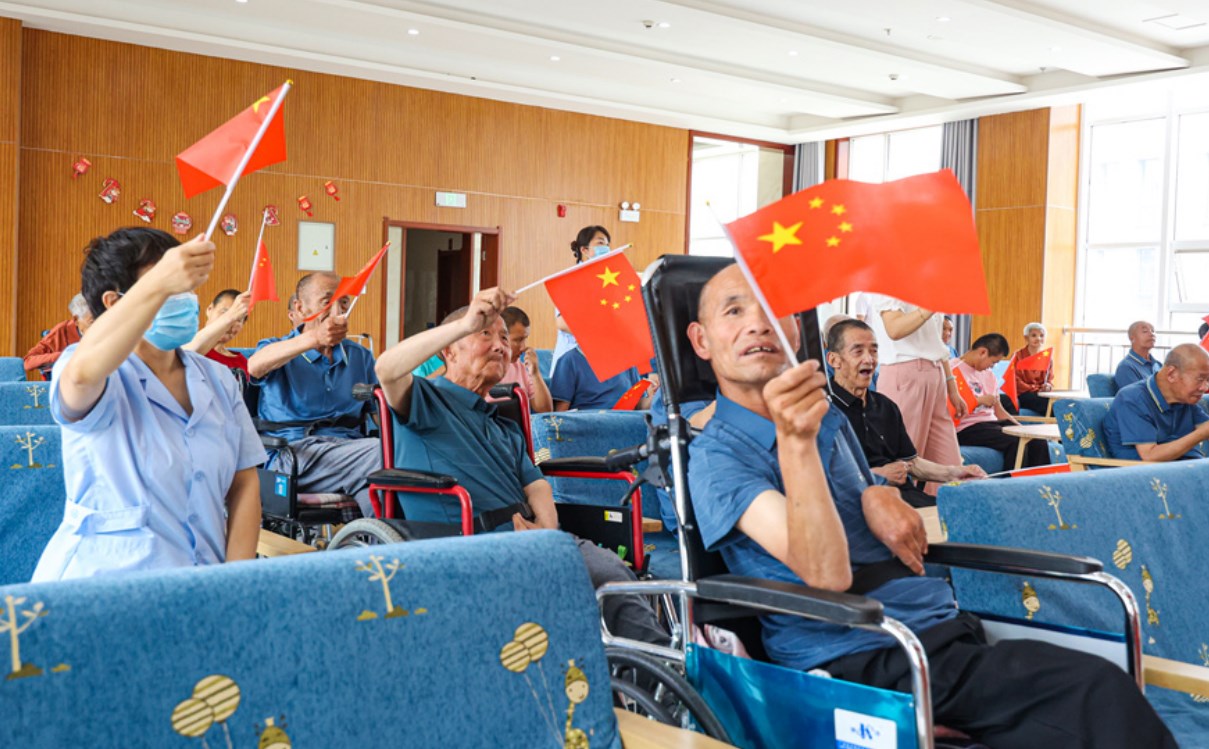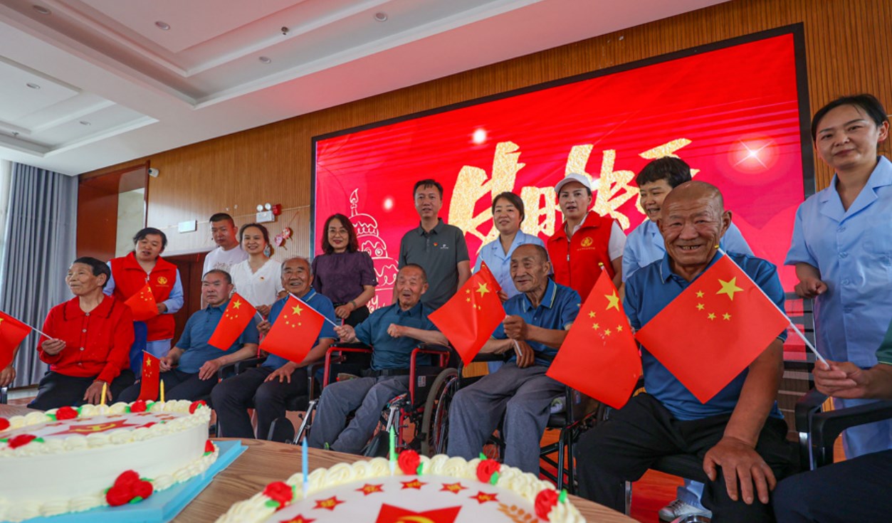 由党员带领着老人们写生日祝福贺卡,老人们纷纷用七彩的画笔写下生日快乐,向党献上自己最真挚的节日祝福;老人们在护理员的带领下表演节目《感恩的心》,感谢党的温暖和关怀,让他们衣食无忧的安享晚年;全体人员手举红旗,合唱《社会主义好》,嘹亮的歌声交织回荡在现场,齐声唱出了对党的祝福,对祖国繁荣昌盛的感恩。之后大家围坐在生日蛋糕前,为党高唱生日歌,庆祝党的102年华诞。最后,老人们共同观看脱贫攻坚主题电影《十八洞村》,影片传递的向上、向善、向美的正能量深深的感染着每一位老人。