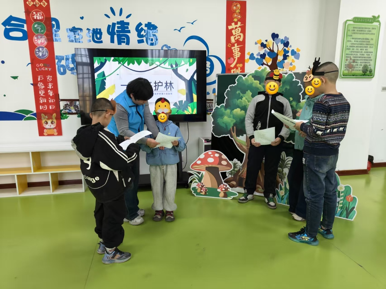 在生态科普宣讲环节,社工结合PPT课件与趣味科普短片,用通俗易懂的语言和鲜活案例,深入浅出地向孩子们讲解森林的生态功能、保护意义及环保小知识,让孩子们系统认识森林与自然、与人类的密切关系。在情景互动体验环节,社工组织孩子们开展“聊聊森林”互动分享与森林情景剧表演,孩子们踊跃举手分享对森林的印象、见过的动植物及植树经历,并自主分组分工,化身森林小卫士、小鸟、小树等角色,自编自演“保护树木”“共生共荣”等主题剧情,用稚嫩话语与真挚情感诠释森林与人类的依存关系,在沉浸式体验中强化环保意识与协作能力。在爱绿护绿实践环节,社工带领孩子们走进站内绿化带,开展浇水、清理杂物等养护活动,将理论知识转化为实际行动,帮助孩子们践行环保理念、提升实践能力。