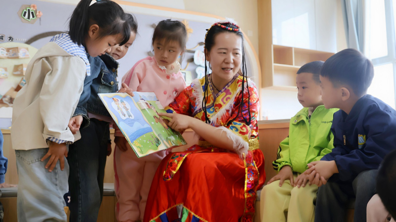 多元活动浸润童心,构筑共有精神家园。创新“五维立体体验”模式,分层级开展沉浸式文化教育。小班开展“民族团结故事会”,通过讲述《文成公主进藏》《草原英雄小姐妹》等经典故事,让幼儿感知各民族交往交流交融的历史渊源。中班组织“认拼中国地图”“找找我的家乡在哪里”互动实践活动,不断增强对伟大祖国的认同感。大班师生共同创作“中华民族一家亲”主题长卷绘画,以艺术形式具象化“多元一体”格局,让民族团结的美好愿景跃然纸上。