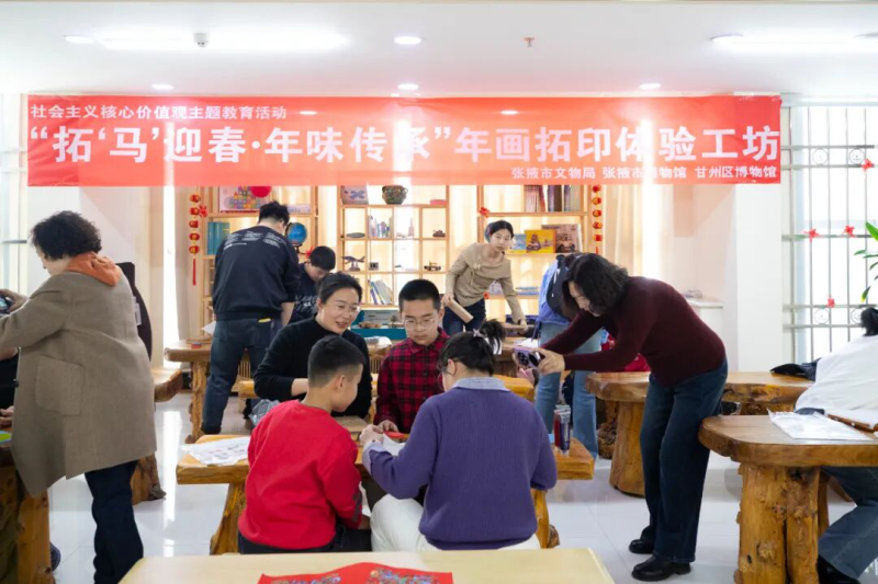 文博活化润人心,共筑各民族共有精神家园。全市各文博场馆精心策划新春活动,成为各族群众品味文化、学习知识的“打卡地”。张掖市博物馆特别推出“彩绘陶马·生肖神骏”主题社教活动,通过组织游客亲手绘制陶马、深入讲解陶马所蕴含的多元民族文化交融元素等形式,让静态文物在公众的参与中“活”起来,成为联结古今、启迪创意、“铸牢”宣传教育的生动课堂。“神骏寻踪·新春探秘”亲子社教活动吸引众多家庭参与,孩子们通过手绘年画、制作裕固族刺绣香包、雕刻山丹烙画、体验甘州剪纸,亲手感悟传统技艺魅力,潜移默化增进对中华文化的热爱。张掖市图书馆同步实行“七天不打烊”,线上线下联动推出多场阅读推广活动,红灯笼与书香交相辉映,老年人在展览中找寻岁月记忆,孩子们在绘本馆里汲取知识养分,年轻人通过数字平台参与文化竞答,弥漫的书香如文化纽带将各族人民相连,成为这个春节里最温暖、最悠长的美丽风景线。