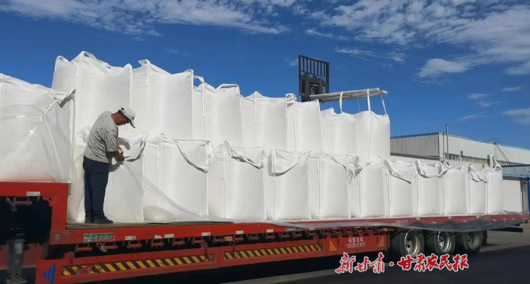 甘肃爱味客马铃薯加工有限公司员工正在搬运生产的马铃薯全粉。